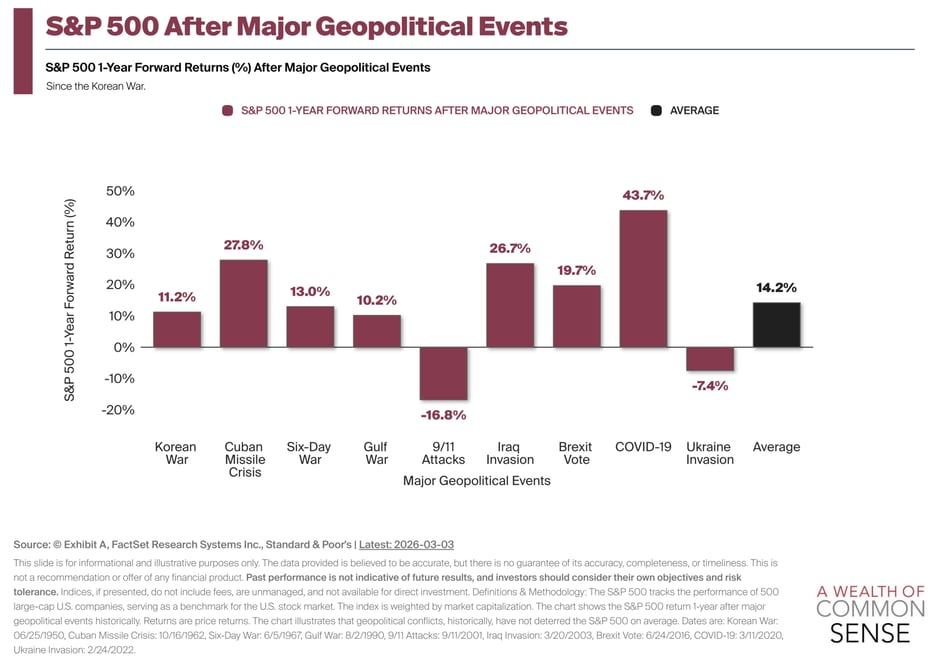 To provide additional context around how markets have historically behaved following periods of heightened uncertainty, we have included a chart that displays performance after some of the riskier moments in history, which inadvertently introduces one of the more important variables in risk and return relationship that many leave out: “time”. The chart displays rates of return a year after major geopolitical events that have occurred over the past 76 years. If you review these, you'll notice the S&P 500 is on average higher 12 months later. Some will say, “this time is different” and we acknowledge that market conditions can differ materially from one period to another. However, we would add that if you look at the worst performing time frame displayed in the chart, beginning September 9th, 2001, and then compare some of our largest “flexible” holdings it may be an even more instructive lesson. Naturally, we must include an obligatory compliance note here that past performance is not indicative of future results, and by choosing three of our biggest “Flexible Mandate/Hedged” holdings rather than a random sample, one could argue that we were “cherry-picking”. As a side note we have selected these holdings because they represent the biggest percentage of our “flexible/hedged” holdings for our clients. We view these positions as components of a diversified portfolio approach that may help support long‑term participation in the market across different conditions. If our goal was simply to show market performance, we would reference long‑only strategies; however, the purpose of this example is to illustrate how different portfolio components may respond in varying market environments. Disclaimers aside, from 09/11/2001 to 9/11/2002, FPA Crescent, First Eagle Global, and T. Rowe Price Capital Appreciation were up, respectively, 10.59%, 12.08%, and 2.15%, while the S&P 500 was down 16.8%. If you carry this further and review the three-year time frame the logic still holds up as FPA Crescent, First Eagle Global, and T Rowe Price Capital Appreciation were up, respectively, 48.28%, 71.46%, and 36.32% versus an S&P 500 that was up 8.18%. Of course, if you take the returns even further out, then you'll see that the S&P return was better (and we are happy to do that if a client requests it), but that's not the point of our exercise. These comparisons are not intended to suggest that any particular outcome will recur. The point is that no matter what strange behavior is going on in the world, we believe that maintaining a diversified, risk‑aware approach can help investors remain engaged with their long‑term plans through a range of market conditions, recognizing that no strategy eliminates risk and that results will vary.